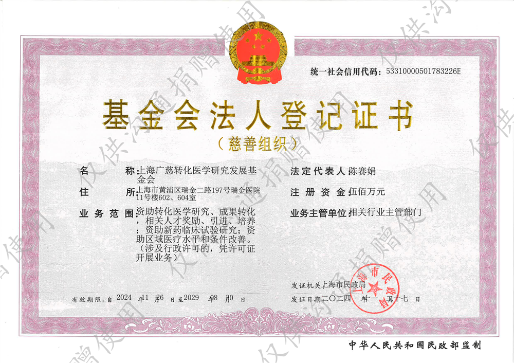 近年来,党中央、国务院对转化医学的发展高度重视,从国家战略高度科学部署国家科技发展和科技创新体系建设,提出大力发展转化医学。2013年7月国家发展和改革委员会正式批准建设转化医学国家重大科技基础设施项目——上海转化医学研究中心(以下简称“中心”)。为了社会资源和慈善性公益组织参与中国转化医学研究的发展,支持上海转化医学研究中心的相关工作,由陈赛娟院士和陈竺院士发起经上海市社会团体管理局批准,2014年9月成立了上海广慈转化医学研究发展基金会。