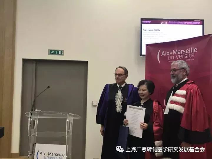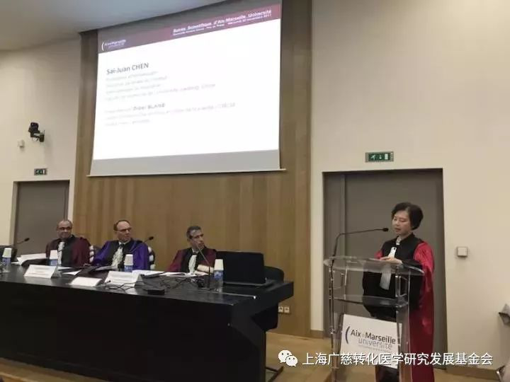 在受聘仪式上,艾克斯-马赛大学校长贝朗教授对陈赛娟院士在血液疾病的基础及临床研究,以及中法血液学交流与合作上进行的努力给予了高度评价。在陈赛娟院士的推动下,上海血液学研究所与马赛大学Paoli-Calmettes癌症研究所在血液学研究领域进行了卓有成效的合作。