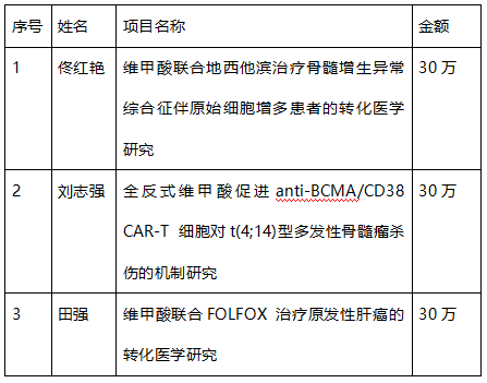 首批“诱导分化疗法”转化医学研究基金(原“全反式维甲酸转化医学研究基金”)课题共收到各单位申请12项,经初审、专家评审组评审,共有3个项目获得资助,现公布如下(见表):