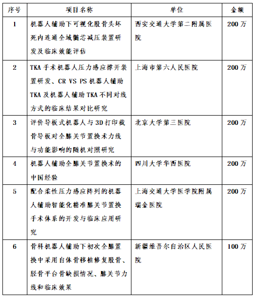今年,该项目收到了各单位申请标书共12份,经初审和复评,共有6家单位拟获得资助,其中智能骨科医学转化项目5项,智能骨科转化援疆项目1项(资助年限为3年),现公布如下:
