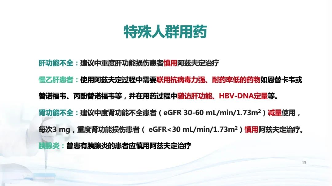 “对于有中、重度肝肾功能不全、慢乙肝、胰腺炎等患者需谨慎使用阿兹夫定,考虑到遗传毒性和生殖毒性的风险,对于妊娠和哺乳期以及儿童患者不推荐使用,育龄期患者需注意避孕措施。”她强调, “慢乙肝患者需联用抗病毒力强耐药率低的药物如恩替卡替诺福韦、丙酚替诺福韦等,并在用药过程中随访肝功能、HBV-DNA定量等指标。中度肾功能不全患者需减量使用,每次3mg。重度肾功能损伤患者则需慎用。”