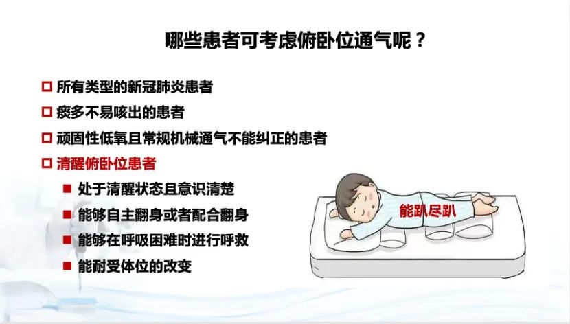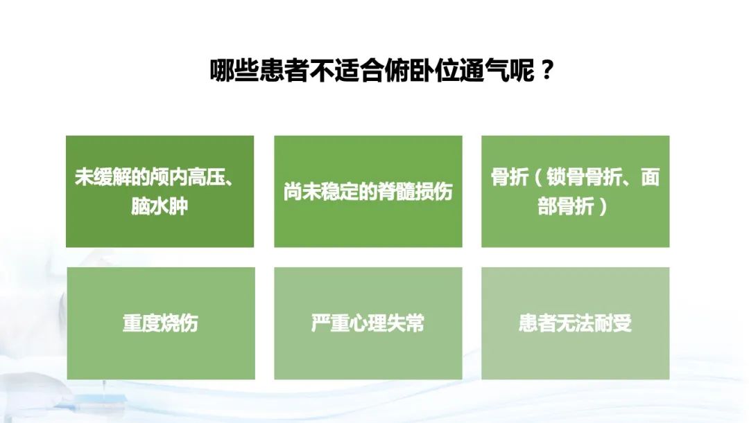 “所有类型的新冠肺炎患者都可使用俯卧位通气,尤其是痰多不易咳出、顽固性低氧、常规机械通气不能纠正的意识清醒患者。”但她同时强调,“有六类患者不适合俯卧位通气疗法:未缓解的颅内高压、脑水肿患者、尚未稳定的脊髓损伤患者、骨折(锁骨、面部骨折)患者、重度烧伤患者、严重心理失常患者以及无法耐受俯卧位的患者。”