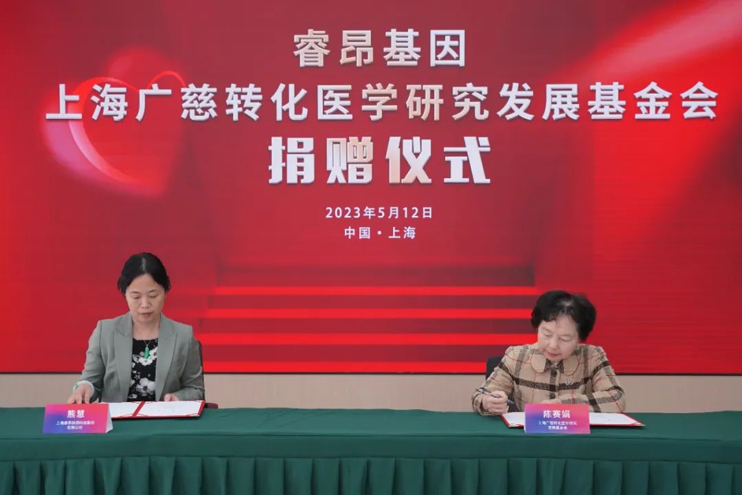 2023年5月12日下午,上海睿昂基因科技股份有限公司(以下简称“睿昂基因”)与上海广慈转化医学研究发展基金会(以下简称“广慈基金会”)的捐赠仪式在奉贤睿昂基因新大楼顺利举行!广慈基金会理事长陈赛娟院士、汪敏秘书长和闻朝君副秘书长,睿昂基因董事长熊慧出席仪式。